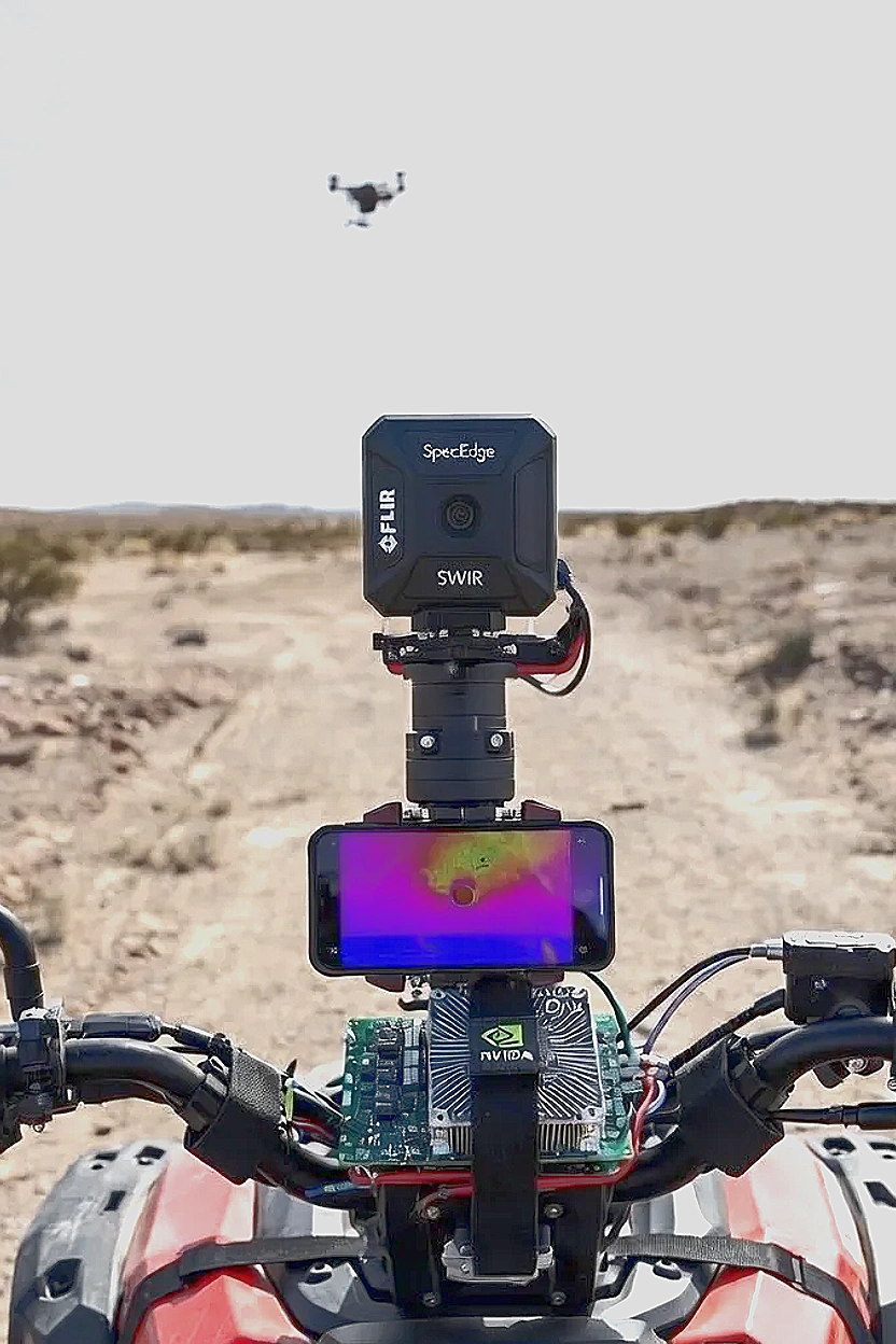 Using SWIR imaging and edge-AI on a Jetson AGX Orin, SpecEdge reads the actual reflectance signature of plastics, composites, and metals — separating drones from birds, debris, foliage, or balloons even when they look identical in EO/IR.
